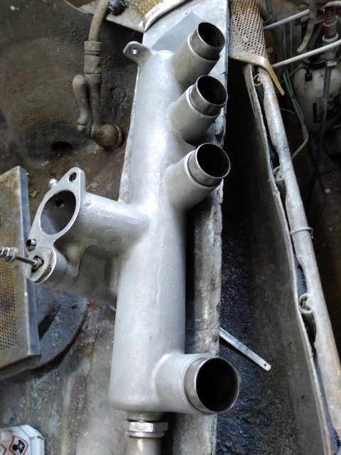 Plutôt que de prendre le risque je change tout le collecteur et vois de petites différences entre les deux, pourtant contemporains: deux piquages d’air sur 1 et un seul sur le second, entrées d’eau de 8 mm sur l’un et 7 mm sur l’autre , un peu contrariant au niveau des colliers de serrage mais bon, je ne vais pas les remplacer et remettre des moches serflex
