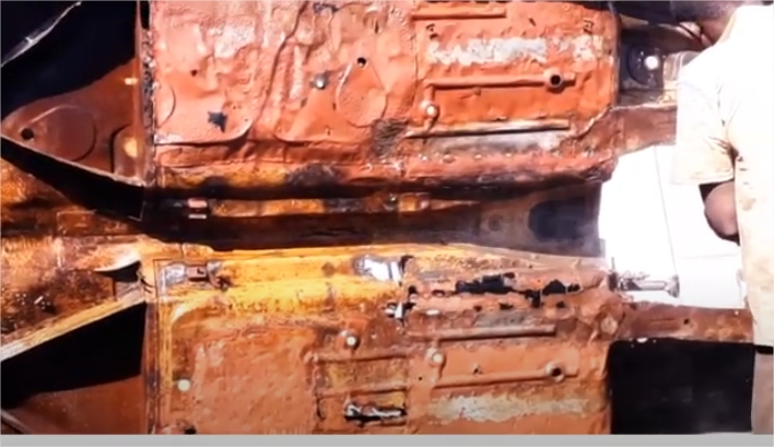 - sur mon Cab de mai 63 dont la caisse a été restaurée je ne vois rien par contre, peut-être parce que cette partie du coffre a été ressoudée lors de la restauration, ou peut-être trop cachée par la peinture et l’apprêt ? (en tous cas je n’ai pas trop envie d’enlever la peinture..).